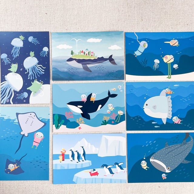 ムームーフォレストの動物たちが海の中を大冒険! 【がえる】 お腹にナゾの傷あとがある伸縮自在のボディの生物。チキンが大好物で、この世のどこかにあるというがえる王国で暮らしている。 【ムームーフォレストのとり】 どこにでもいる普通の鳥。 特に特徴はなし。 脇役だったのに酉年で突然脚光を浴びてメインキャラクターに躍り出た逸材。 【とりお・ざ・とりーず】 個性的なとりのトリオ。グループ結成時は4羽いたけれど、首とくちばしと足が長い子がソロデビューすることに決まりトリオになった。小さい方からトリタロウ、トリジロウ、トリザブロウ(芸名) *** 海の生き物のポストカードです。 全部で13種類。 お好きな絵柄をお選びください。 絵柄により、印刷や使用している用紙が変わります。 【サイズ/枚数】 148mm×100mm/1枚 【素材/印刷】 ①がえるとマンボウ マットコート紙180kg/オフセット印刷 ②とりお・ざ・とりーずとクラゲ マットコート紙180kg/オフセット印刷 ③迫りくるジンベイザメ マットコート紙180kg/オフセット印刷 ④がえるとくじらの島 マットコート紙220kg/オフセット印刷 ⑤がえるとエイ 光沢紙/インクジェット印刷 ⑥がえるとクラゲ マットコート紙220kg/オフセット印刷 ⑦がえると北極旅行 光沢紙/インクジェット印刷 ⑧とりお・ざ・とりーずの南極旅行 光沢紙/インクジェット印刷 ⑨がえるとイルカ 光沢紙/インクジェット印刷 ⑩がえるととりとチョウチンアンコウ 光沢紙/インクジェット印刷 ⑪とりお・ざ・とりーずの潜水艦 光沢紙/インクジェット印刷 ⑫シャチと全員集合 光沢紙/インクジェット印刷 ⑬がえるとしろくま マットコート紙220kg/オフセット印刷