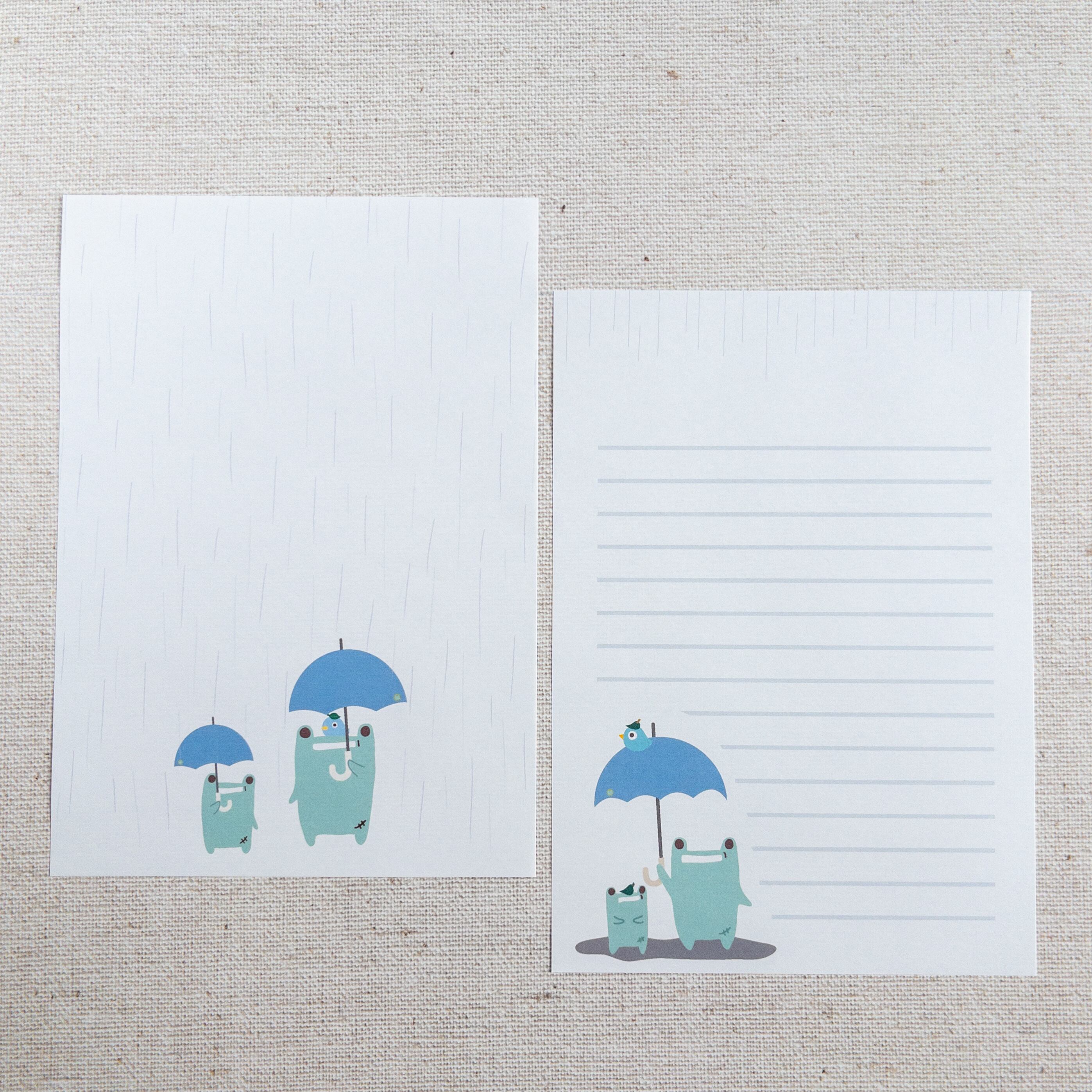 ムームーフォレストの仲間たちの、ほのぼの梅雨時間を描いた便箋セットです。